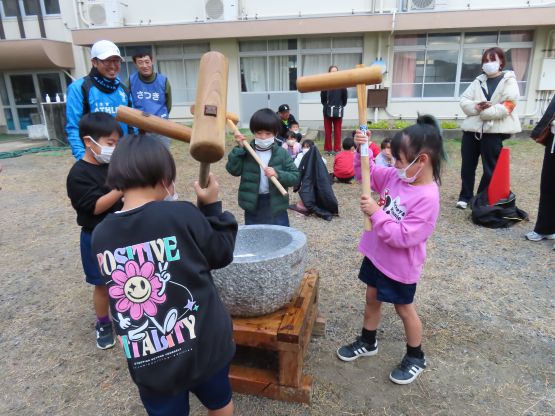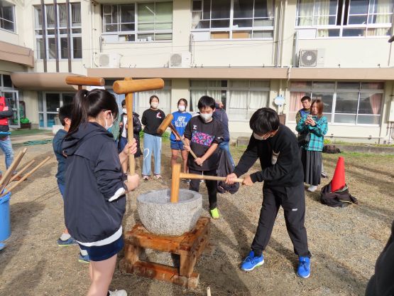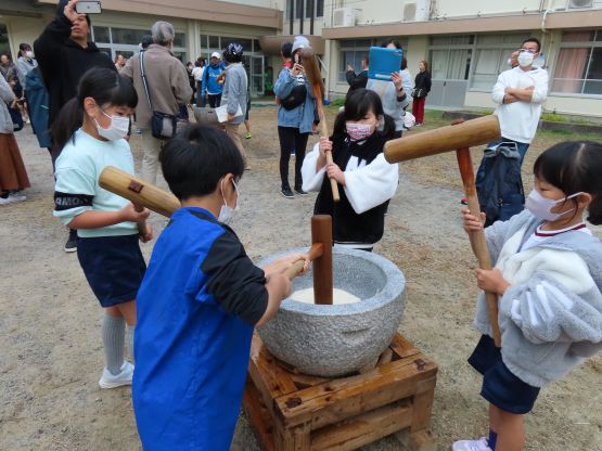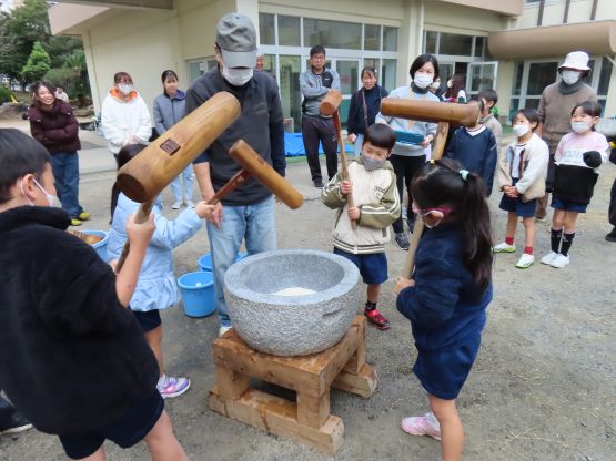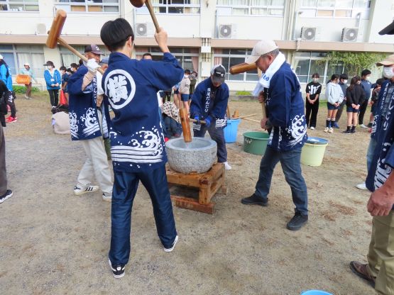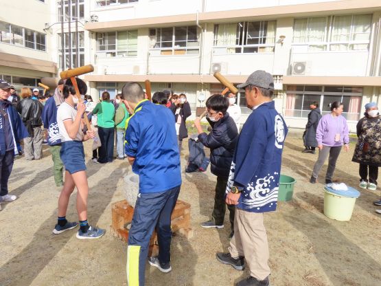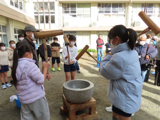 その応援の時間帯には、地域の方や保護者の方と中庭でもちをつきます。中庭からは、今年も「1、2、