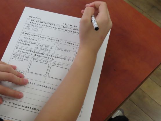 そして、その日に自分が食べた朝ごはんをワークシート書き出し、その食材から上のどのスイッチが入っ