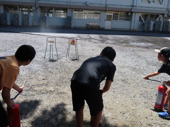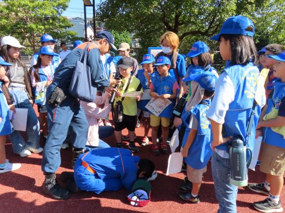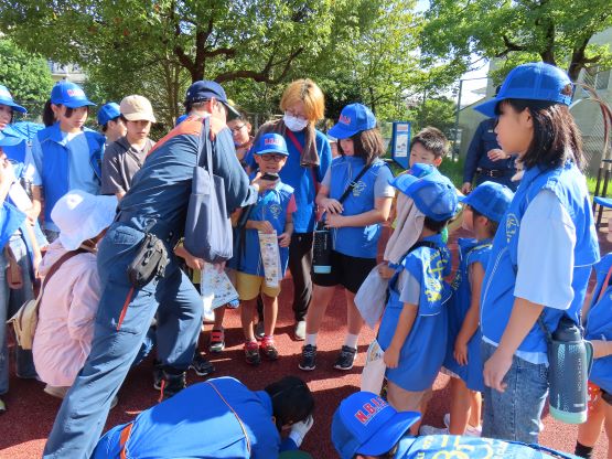 クラブ以外の横尾っ子34名が消防団員の方々と一緒に秋寄公園まで行って、以下のような体験を