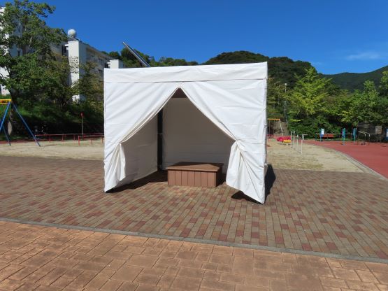するベンチ、防災テントを張ることができる東屋、防火水槽についての見学、説明
